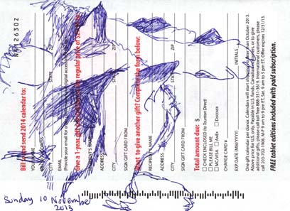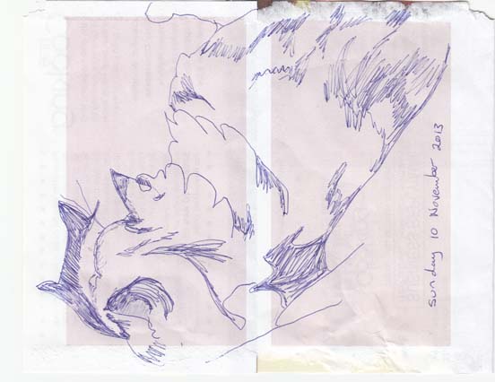 We were having a lovely time sitting in bed and reading this morning when our cat decided to join us. Not wanting to disturb her I grabbed what was to hand, some pull out pages from my partner’s magazine, and my nearest pen. I made three sketches of the cat.