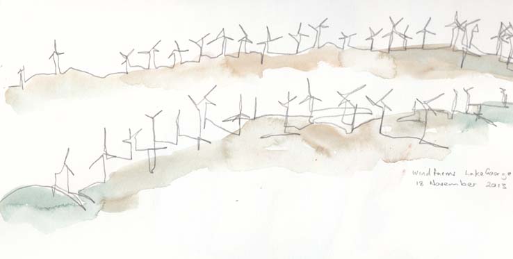 The other day I had to drive up to Goulburn to collect my work that was in the Goulburn Art Award. Half way between Goulburn and Canberra lies Lake George. While the lake’s comings and goings have been of interest for many years, the current ‘big issue’ are the numerous wind turbines that have been installed on the south-eastern side of the lake. I thought it was about time that I stopped at one of the rest areas on the lake shore and did some drawings of the turbines.