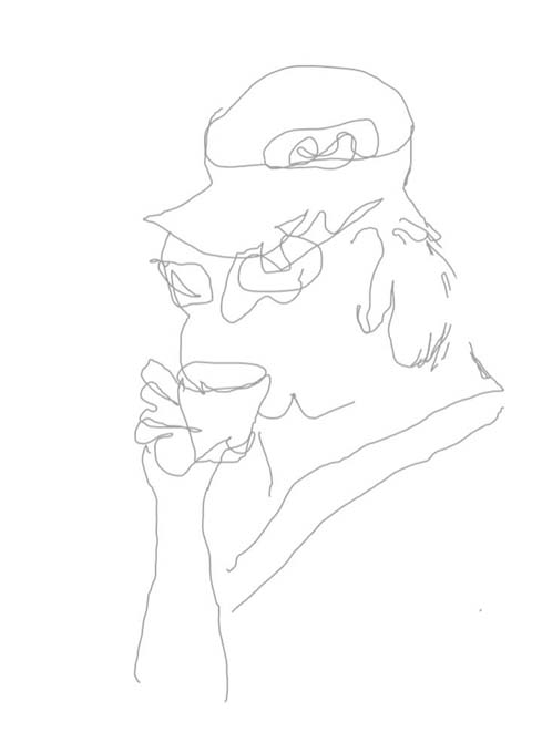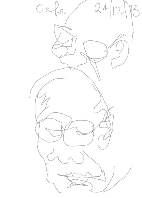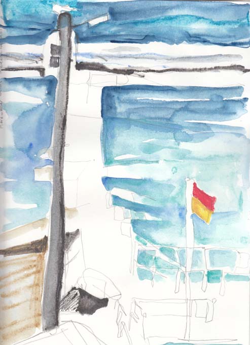 There were several challenges to doing this drawing, not the least of which was re-setting the lights to ‘steady’, rather than a fit-inducing flashing sequence. The biggest problem was the colour of the light itself. Being such an intense blue (it gives a real disco fluorescent whiteness to any white clothing), it was a challenge to firstly see my page let alone get some realistic colour onto it.