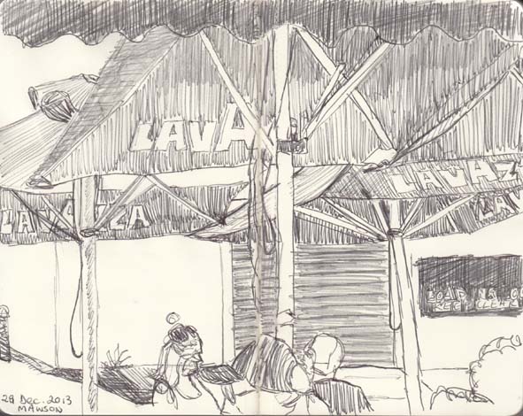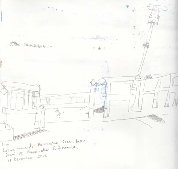 So, a la Vincent, I put on my camping headlight so I actually had a white light to work on my page. Capturing the intensity of the individual lights and the backwash of colour has proved quite difficult. However I’m happy with this first attempt. I will try to develop a more intense version of this scene, using photographs I’ve taken as I’m not sure that I could take another half hour session sitting in this light. After finishing I got one of those ‘afterglow’ optical effects where everything I saw went ‘orange’. The only other time I have had such a strong effect was in experiencing James Turrell’s work Open Field, at the Chichu Museum on Naoshima Island in Japan.