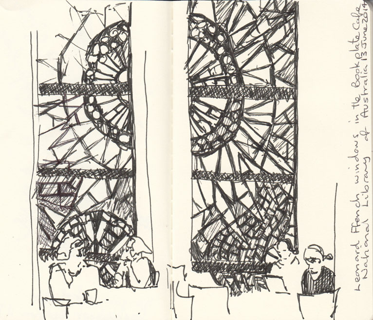 While it is definitely a place I’ve visited many times, I’ve never stopped to draw inside the the National Library of Australia before. The Bookplate Cafe, tucked into a corner of the foyer has the luxury of incorporating several stained glass windows designed by the artist Leonard French. Aided by what must have been the biggest bucket of coffee I’ve ever had, I was able to make the following sketch. That is until my pen ran out of ink. All to the good, according to my partner who told me that I was in grave danger of over-working the sketch as it was.