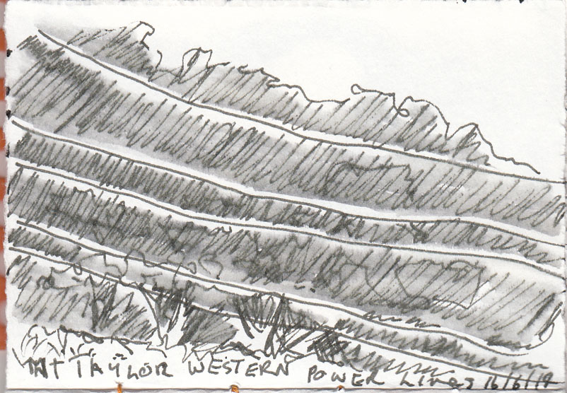 Next my interest was captured by what I could see behind the tree. This is a series of high voltage power cables that traverse this side of the mountain – they actually hang in much smoother curves than I could draw! It was a challenge to try and capture the light-grey cables against the darker toned eucalypt trees on the higher slope of the mountain.