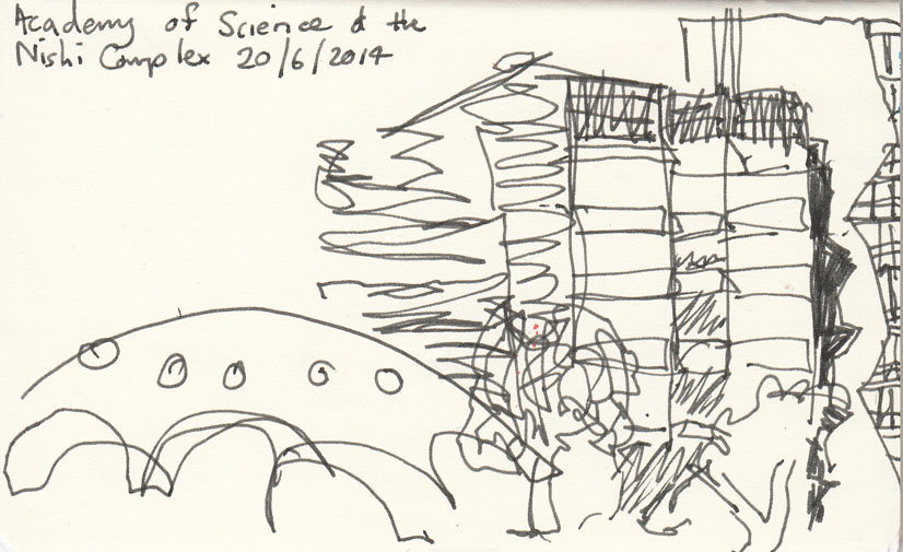 The Academy of Science Building, also called the Shine Dome (a.k.a 'the Martian Embassy') and the Nishi Building, New Acton, pen and ink, 20 June 2014.