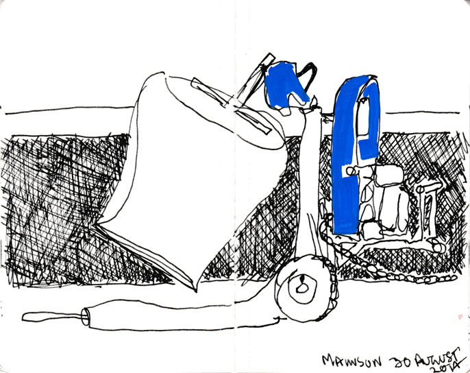 I continue to be captivated by construction. There is building work going on across the way from where we regularly buy coffee. Here is a look at the current state of scaffolding and wire safety fences. The biggest problem is the wire which was lighter in tone that the building behind it. I had trouble working out how to get the different grey tones working while I was on location, so I added some watercolour when I got home. When I scanned my amended version of the drawing I could see that the upper half of the windows weren’t looking like they were part of the whole. So with some additional drawing I came up with the final version.