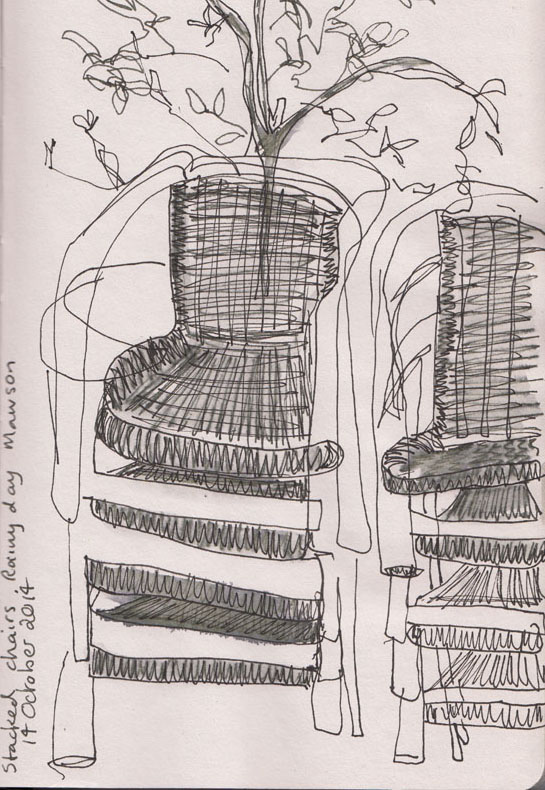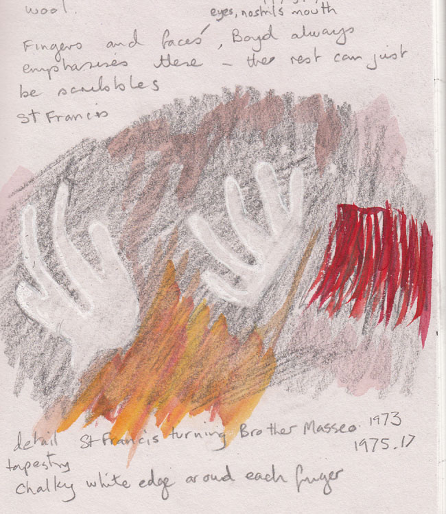 In his later works, the figures emphasise hands and feet, and faces are represented by blots for eyes and nostrils and small lines for mouths. These are no less powerful works for their brief notations. I tried to capture this focus in the quick study of the hands in one of the works in the St Francis tapestry series.