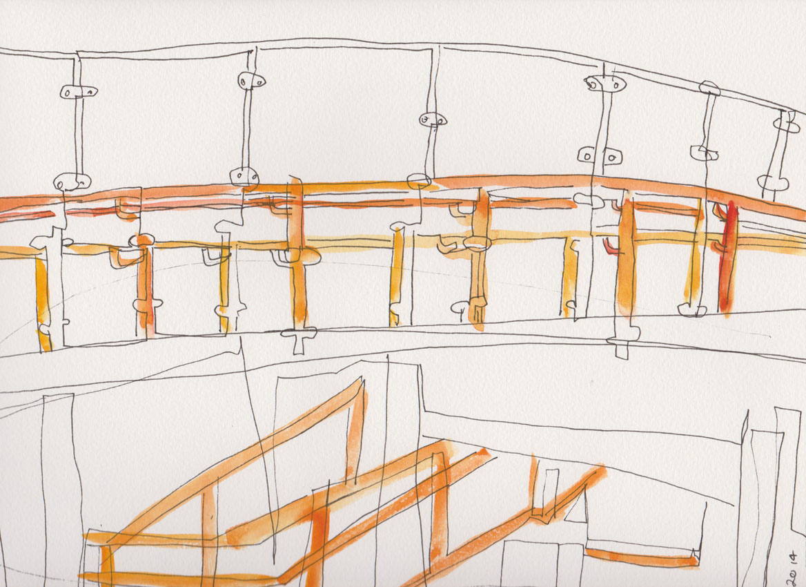 Initial blind drawing, pen and ink as well as using watercolour to indicate some of the different elements of the bridge, 19 December 2014