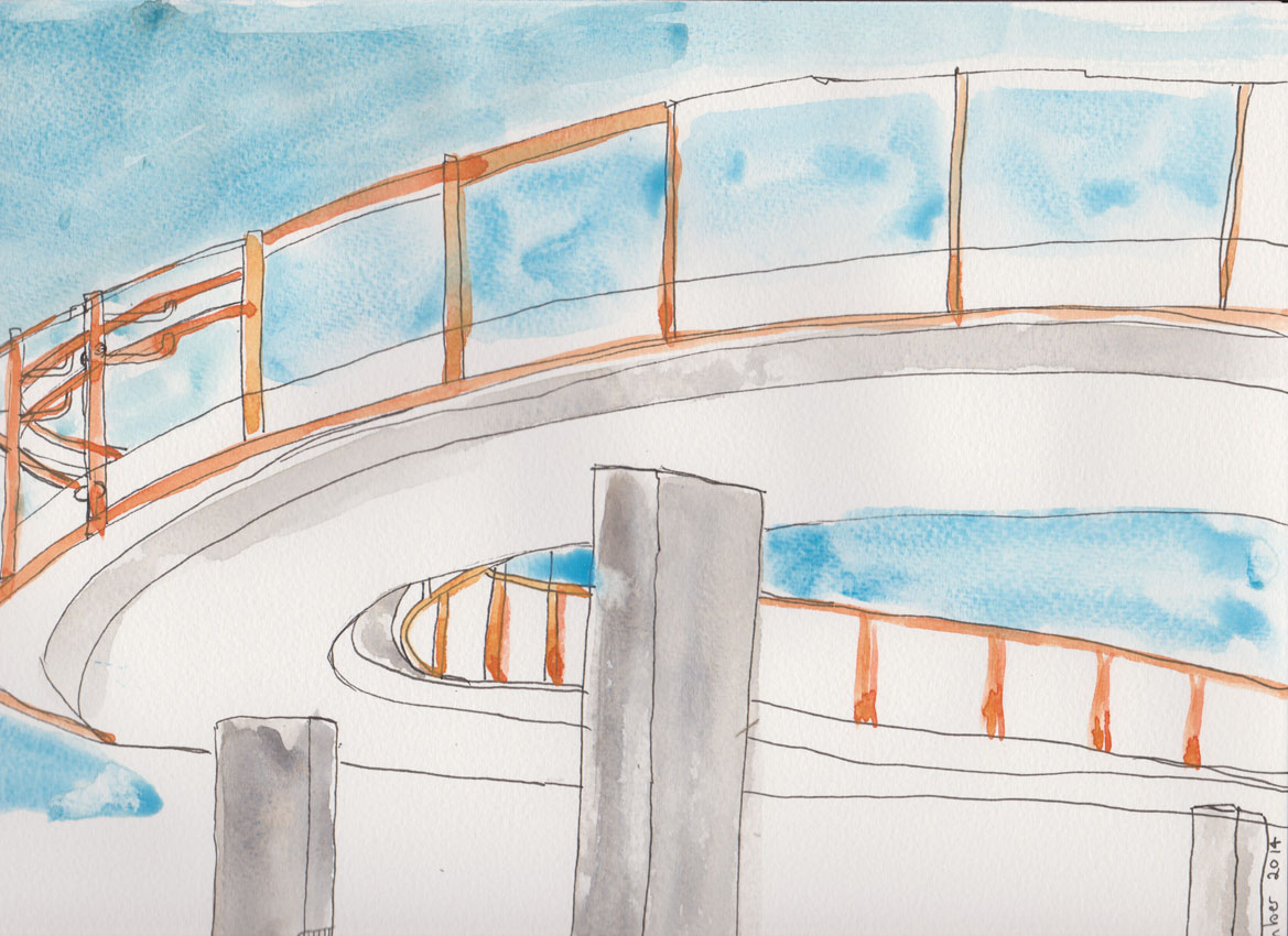I thought this section was perhaps a bit ambitious for a first attempt, so I switched my attention to the curving bike ramp instead. I was reasonably happy with this until I realised that I was struggling to getting the double hand rail and its’ support structure in the correct position. I added the watercolour as I wanted to keep in mind the silhouette of the ramp against the skyline.
