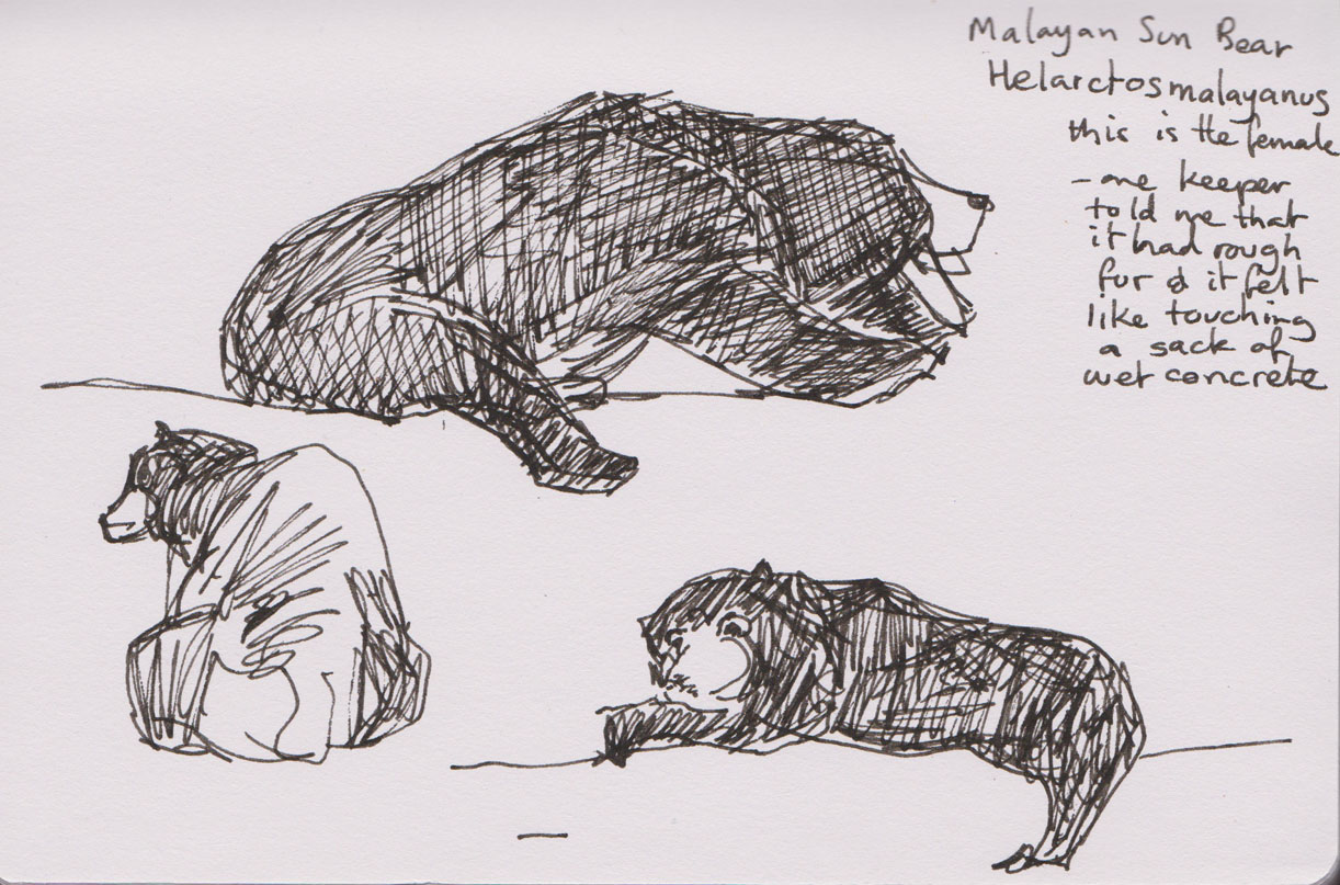 Not far away was the Malayan Sun Bear (Helarctos malayanus) enclosure. A passing keeper told me that I was looking at the female bear and added that the bear had rough fur and patting the bear felt like touching a sack of wet concrete. The bear’s fur looked very dense and its body was clearly very ‘solid’ underneath it. It’s not surprising that the habitat of the bear is tropical rainforest and montane forests where the dense fur is able to repel rain. I watched while the bear moved around on the telephone pole log frame in her pen, the logs she was on are about 3-4 metres above the ground.