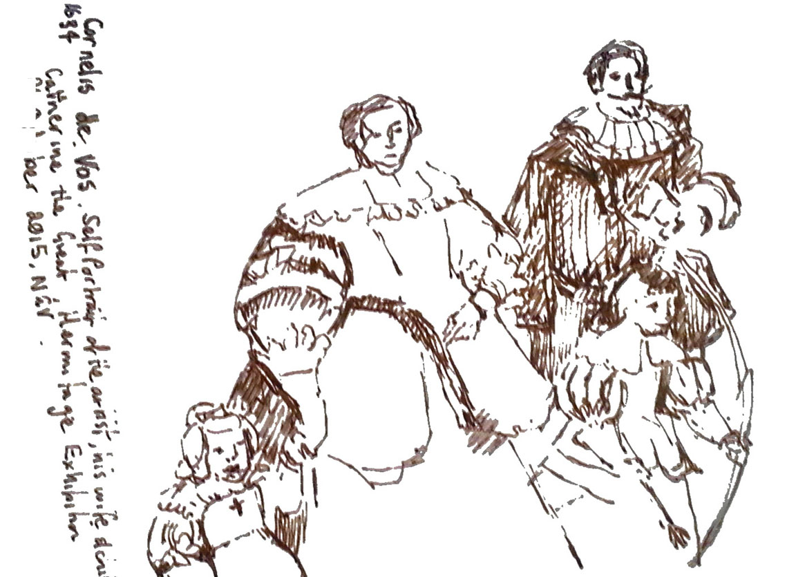 Self-portrait of the artist with his wife Suzanne Cock and their children, c1634, oil on canvas, my sketch in pen and ink