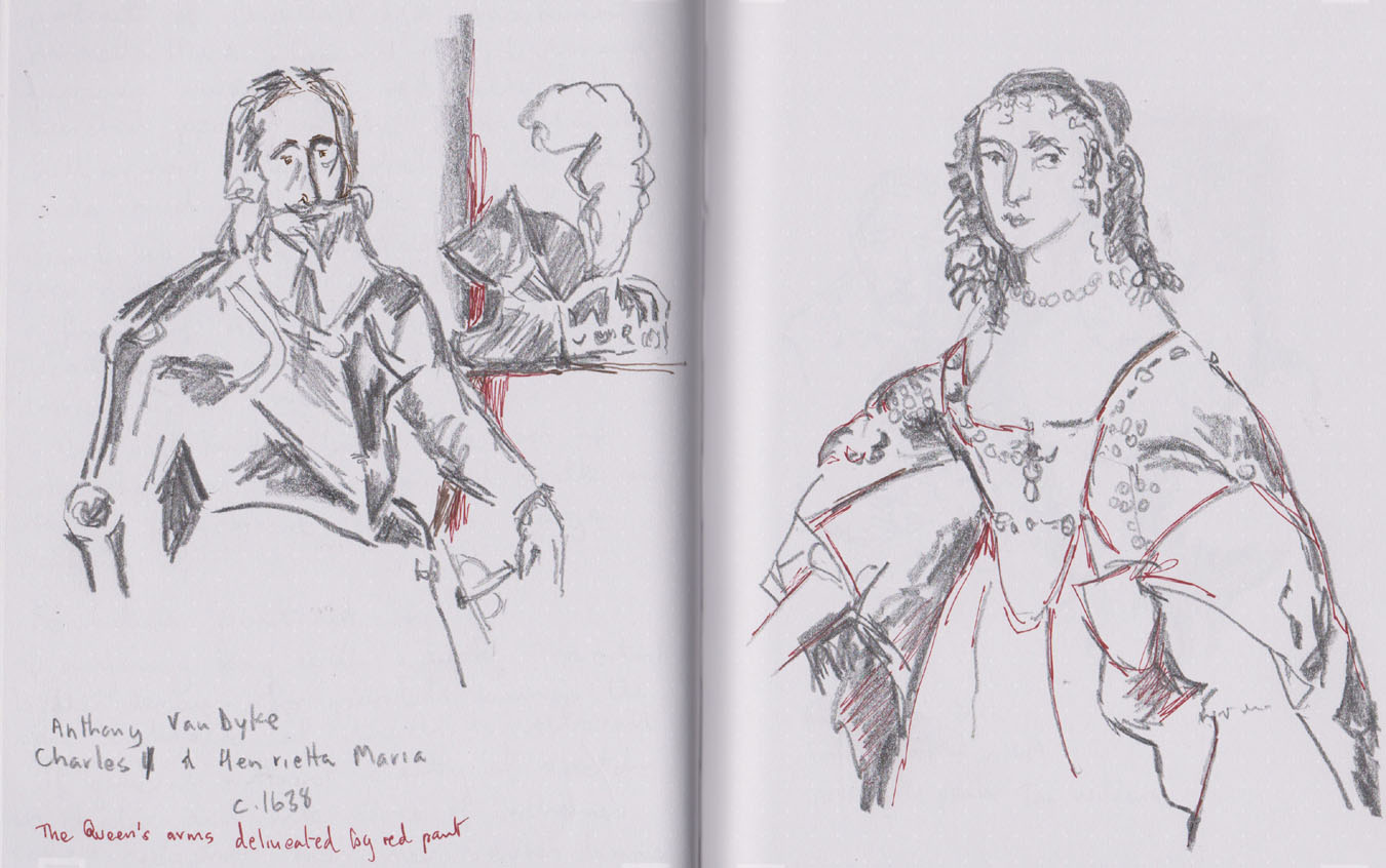 A large leap up the social ladder from the wealthy merchants that de Vos painted are Sir Anthony van Dyck’s paired portraits of Charles I of England and his Queen Henrietta-Maria. At over 2 metres in height they dominated the room they were hung in. The refinement of their faces, the lustre of the armour, silk and pearls made them hard to look away from, as was no doubt intended.