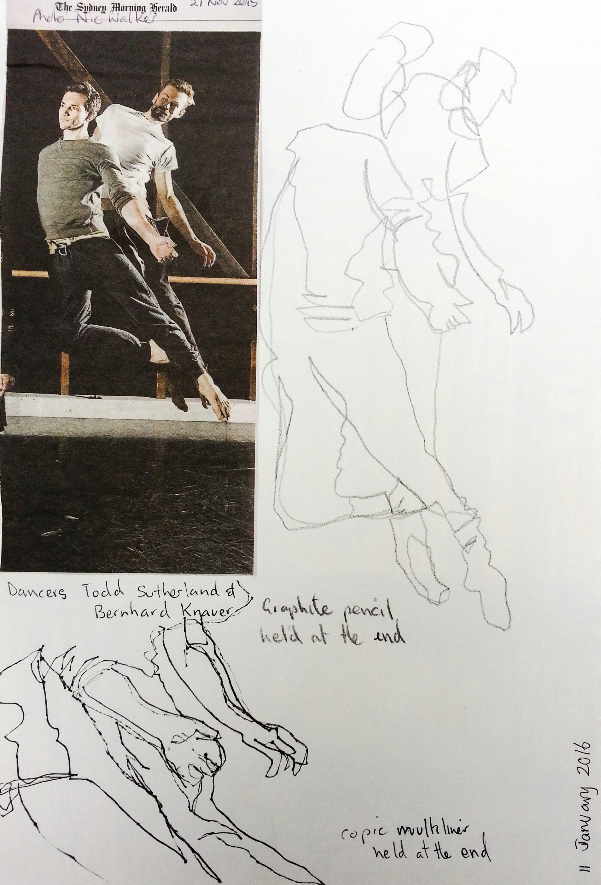 So it’s back to exploring and applying some previous exercises and being conscious about using all the techniques I’ve learn to express my own style. To avoid getting stuck on what to draw I’ve been working from photographs taken by Nic Walker , of the Sydney Dance Company, (published in the Sydney Morning Herald of 21 November 2015).