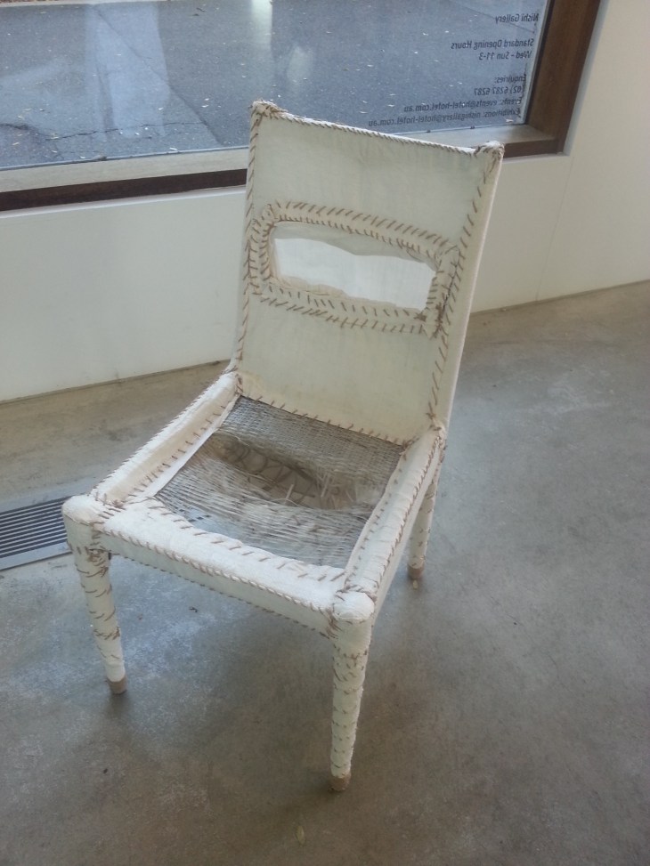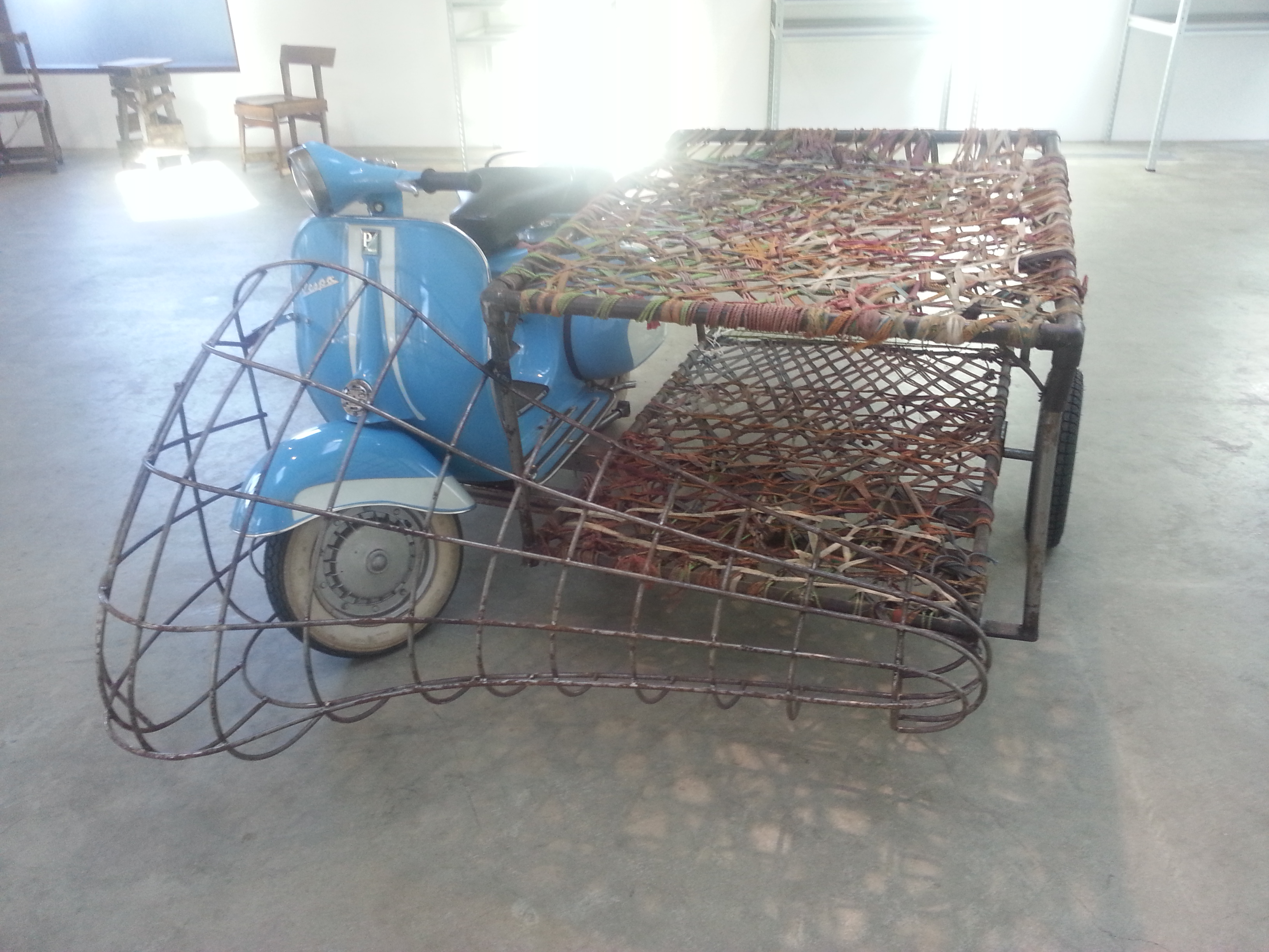 Porosity Kabari (Nishi Gallery, New Acton, Canberra) is a collaboration between Trent Jansen, Richard Goodwin and Ishan Khosla. The trio “investigates the cycle of use, re-use (and further re-use) – and how we can, simply, use one thing to make another thing.” Using only materials and skills sourced from the ‘Chor Bazaar’ (Thieves Market) and the Dharavi slum in Mumbai, the outcome is a series of objects that fascinated me with their detail and juxtapositions, and showed an enjoyable lack of concern for ‘perfect’ functionality.