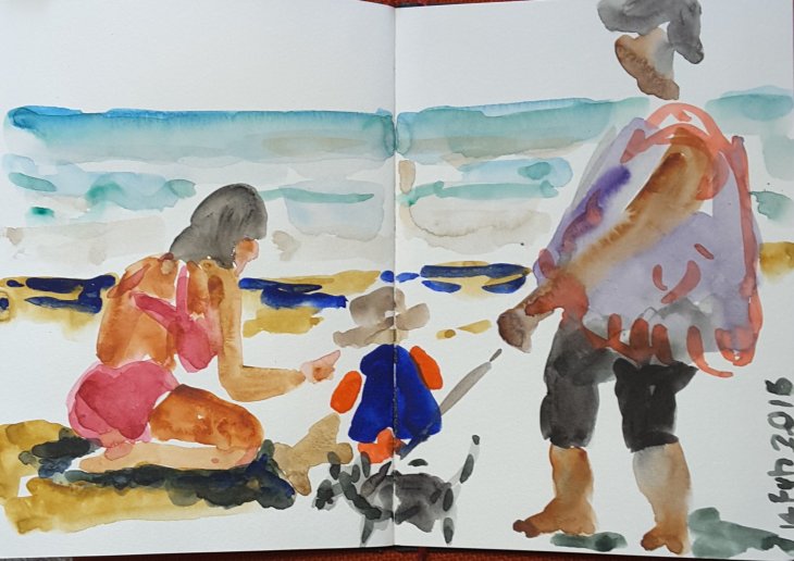 We continue to head down the coast for our weekly swim while the weather and the east-coast current are warm. We have a decent sized beach shelter so between bouts of swimming and boogie-boarding we can sit comfortably inside out of the sun and sketch.