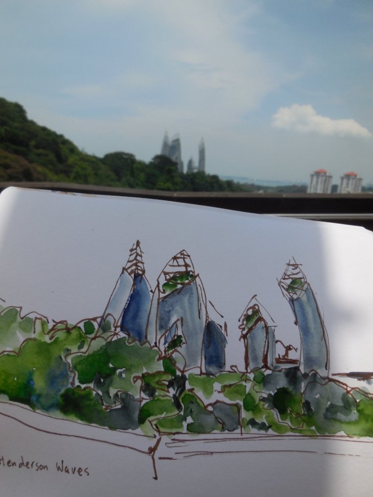 We were interested in sketching this modern marvel. It’s deck is made of balau wood and the seating areas along the bridge provide a suitably challenging set of curves for a sketcher to tackle. On this typically hot and humid day it also had the best breezes going.