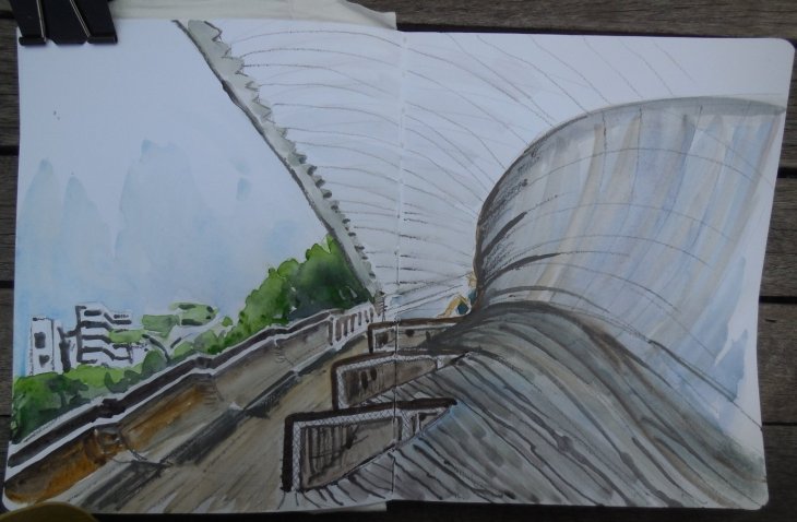 Wow. What a structure. I can imagine how hard it would be to sketch. I also like your depiction of the nearby buildings.