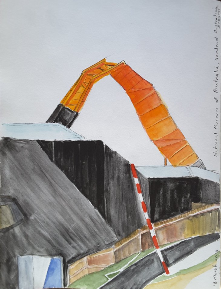 We visited the National Museum of Australia to sketch over the weekend (quite a few months of weekends back!). The building is certainly quirky and in many ways fails to fully deliver the concepts which lead it’s design. (I note that there has been a recent announcement that the rivetting stretch of concrete outside the museum will be removed and turned into a garden of Australian plants. Three cheers for common sense).