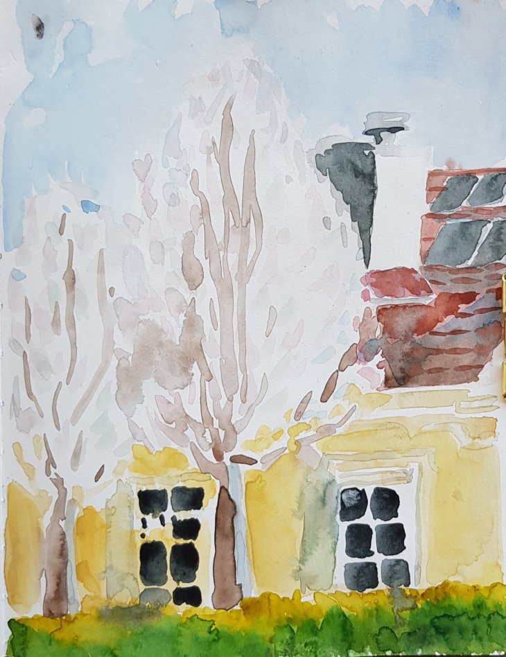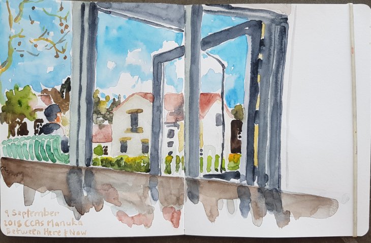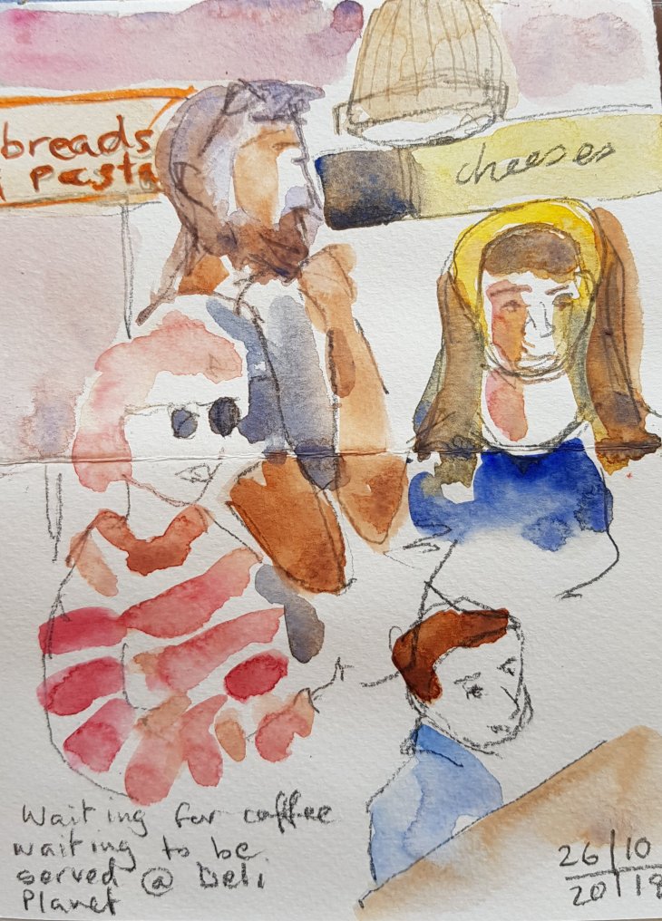 What used to be Cafe Wednesday has, with a slight drifting of routines, now become Cafe Friday. At present I am carrying a small booklet made from an A3 page of Fabriano watercolour paper, which I stitch together and fold into an old bank bookholder (those were the days!). In the holder I also carry some home made paint dot cards and the obligatory coffee loyalty card.