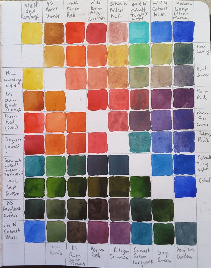 l was spurred on to paint this chart while watching one of Teoh Yi Chie (aka Parka) Parka blog’s videos where he demonstrated that one of the uses of a colour swatch was to work out if two ‘similar’ colours were worth keeping in your palatte.