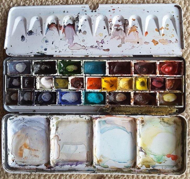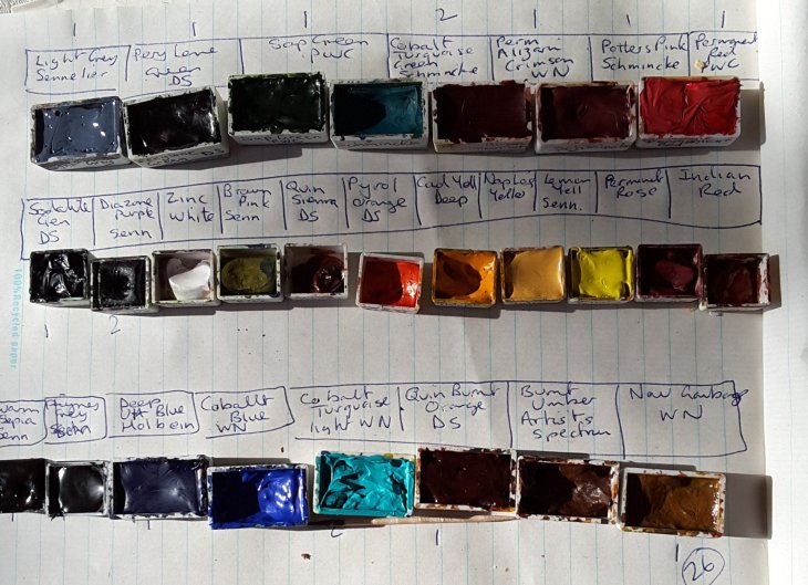 Longer term I also added full pans, all of which are filled by tube paint. It took me a while to appreciate that using full pans made it easier to get juicy colours onto my palette and paintings, without unnecessarily wearing down the hairs on my good brushes. When travelling using full pans also means less refills.