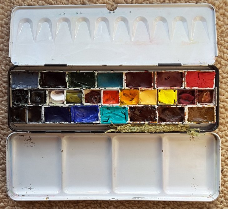 So having started out using the kit as purchased, this paint box has been modified as I have gone along. The original set only had pans in half of the box, so I immediately started filling the empty spaces with extra half pans I bought as I travelled.