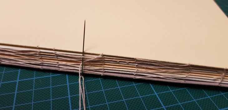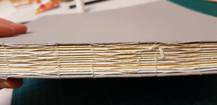 I have included some close-up photos of the spine, as I wasn’t familiar with this stitch. In short you take your thread in and out through the holes in the pages and then back under the stitch below on the outside spine of the book. This results in the ‘cross’ pattern on the book’s spine. I have secured both ends with a coptic binding stitch.