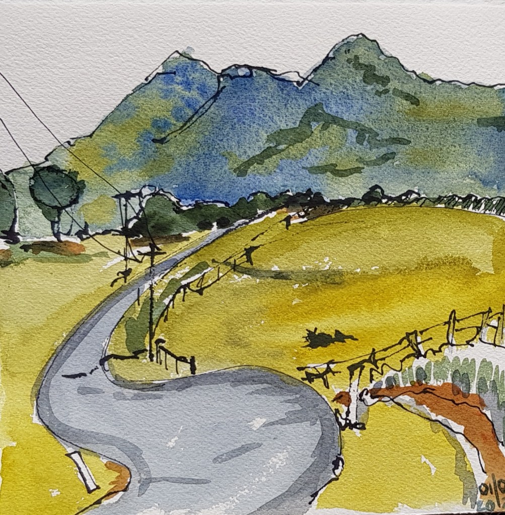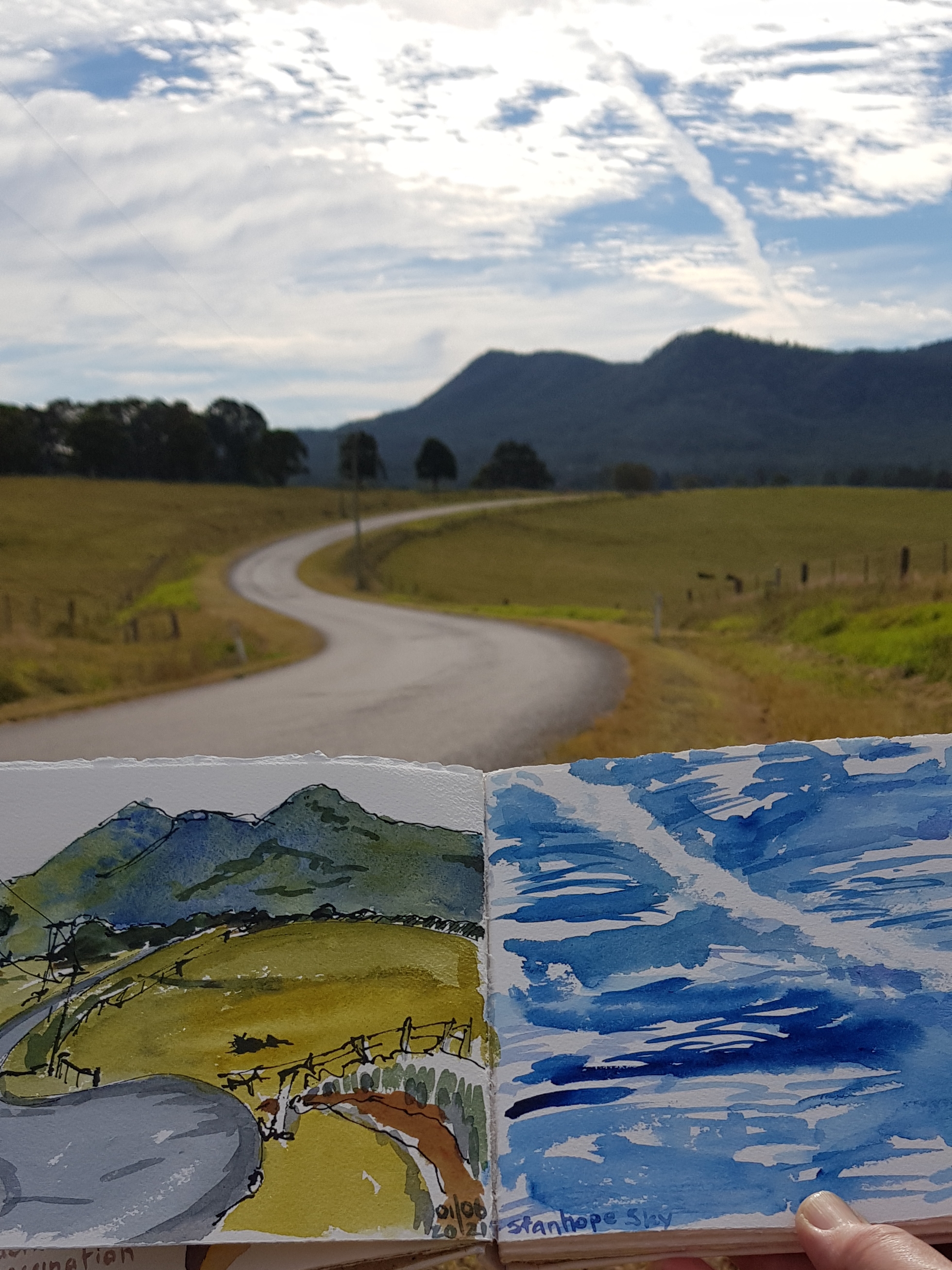 Looking down the road to the mountains. Pen and ink and watercolour. The skies were amazing so I tried a cloud study.The two pages of my sketchbook. Part way through my 3rd sketch, trying to block in big shapes with some wet into wet painting.The finished sketch. The most accurate colour is the red triangle in the foreground, which is a dam covered in duckweed.