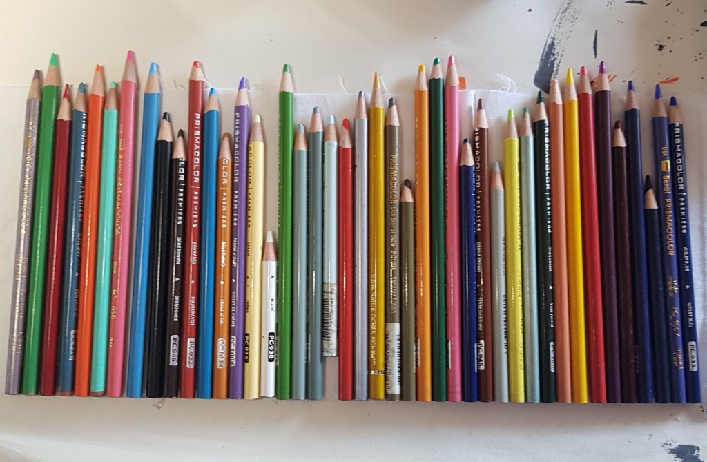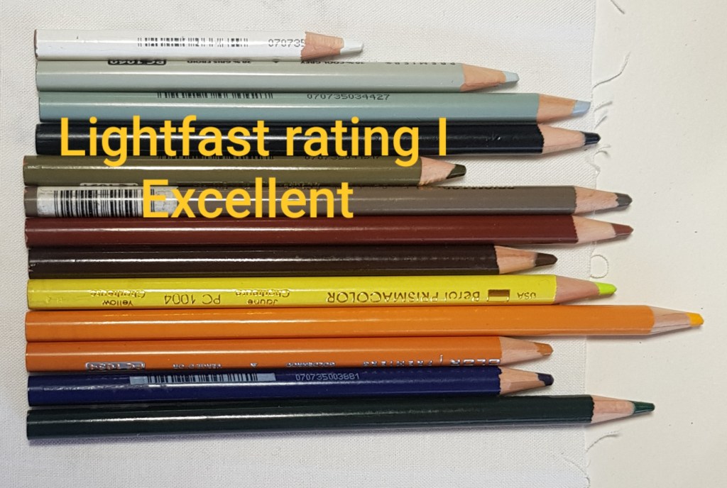 I had a hunt through my pencil box for my Prismacolors and checked them against the lightfastness chart that the company has released. I discovered that just over half of the colours that I own are in the top two lightfastness ratings categories. Phew! Those pencils I can continue to use without worry. The rest are in the bottom three categories. That means I wouldn’t use them for any work that I would be likely to sell, but I can use them on casual projects or for general ‘colouring in’ activities.