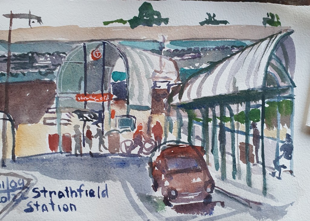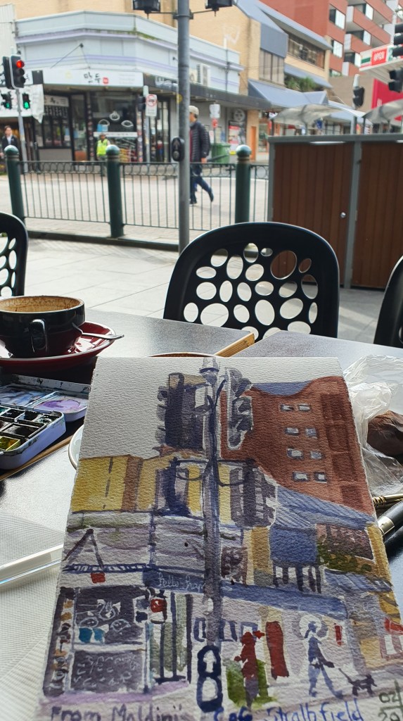 You probably won’t be surpised that this has meant sitting in cafes and sketching, although it’s also been about taking the opportunity to look out at the busy urban settings as much as drawing people. We are staying in the inner-ish suburb of Strathfield, close to the railway  station. It’s a lively area with plenty of activity all day.