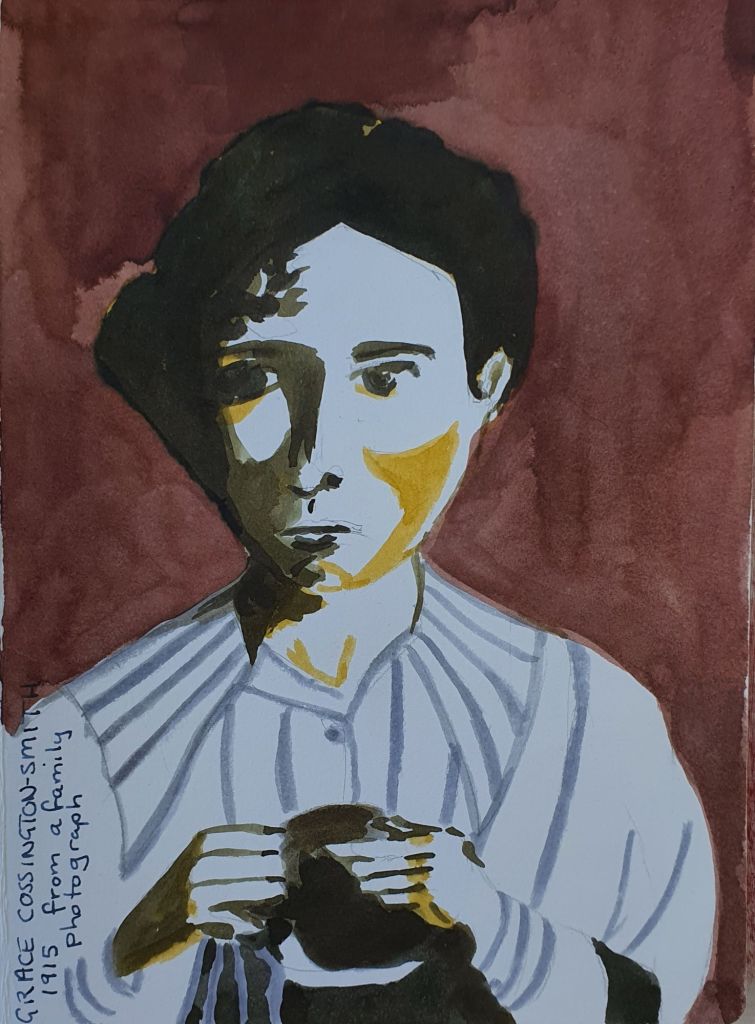 I didn’t have much luck finding photos of Clarice to work from. This one, which I’m guessing is from the late 1920’s early 1930’s, at least shows her in her preferred occupation,  painting at Beaumaris, where so much of her work was made.