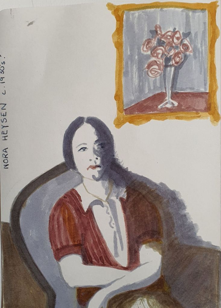 Later, while researching work on some of her father’s paintings, curator Lou Klepac saw her work, and recognised it’s quality. He mounted a major exhibition of Nora’s work in 1989. In conjunction with the National Library of Australia, Klepac held another successful exhibition of her work in 2000.