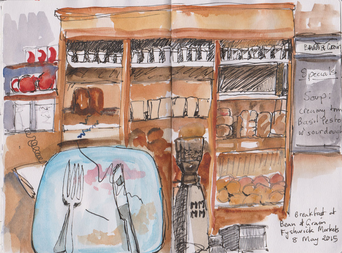 This sketch of breakfast at the Bean and Grain cafe, at the Fyshwick fruit and vegetable markets, was done in several stages. I started it several weeks ago but didn’t get a chance to finish it until last week. I decided to add my breakfast plate (after the yummy serve of bakery-made crumpets was gone) for a bit of extra interest.