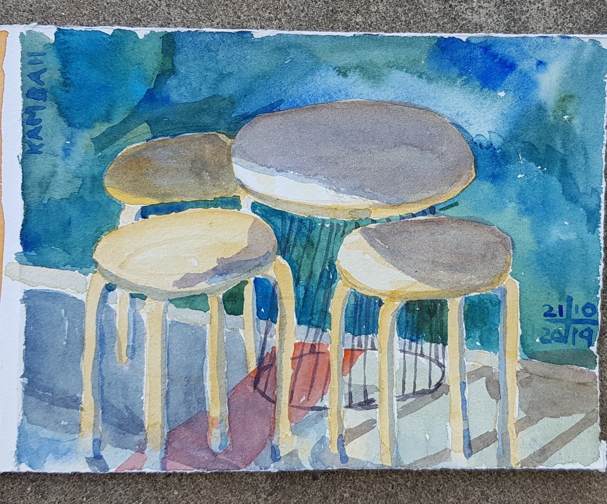 While completing this sketch it dawned on me that the shadows of the stools were also fascinating. One set was being cast by the sun and the ones you see in the painting were cast from the light reflected from the plate glass windows of the cafe. Sadly time and a lack of paper meant that I didn’t make a third sketch, but perhaps I can work on that next time.