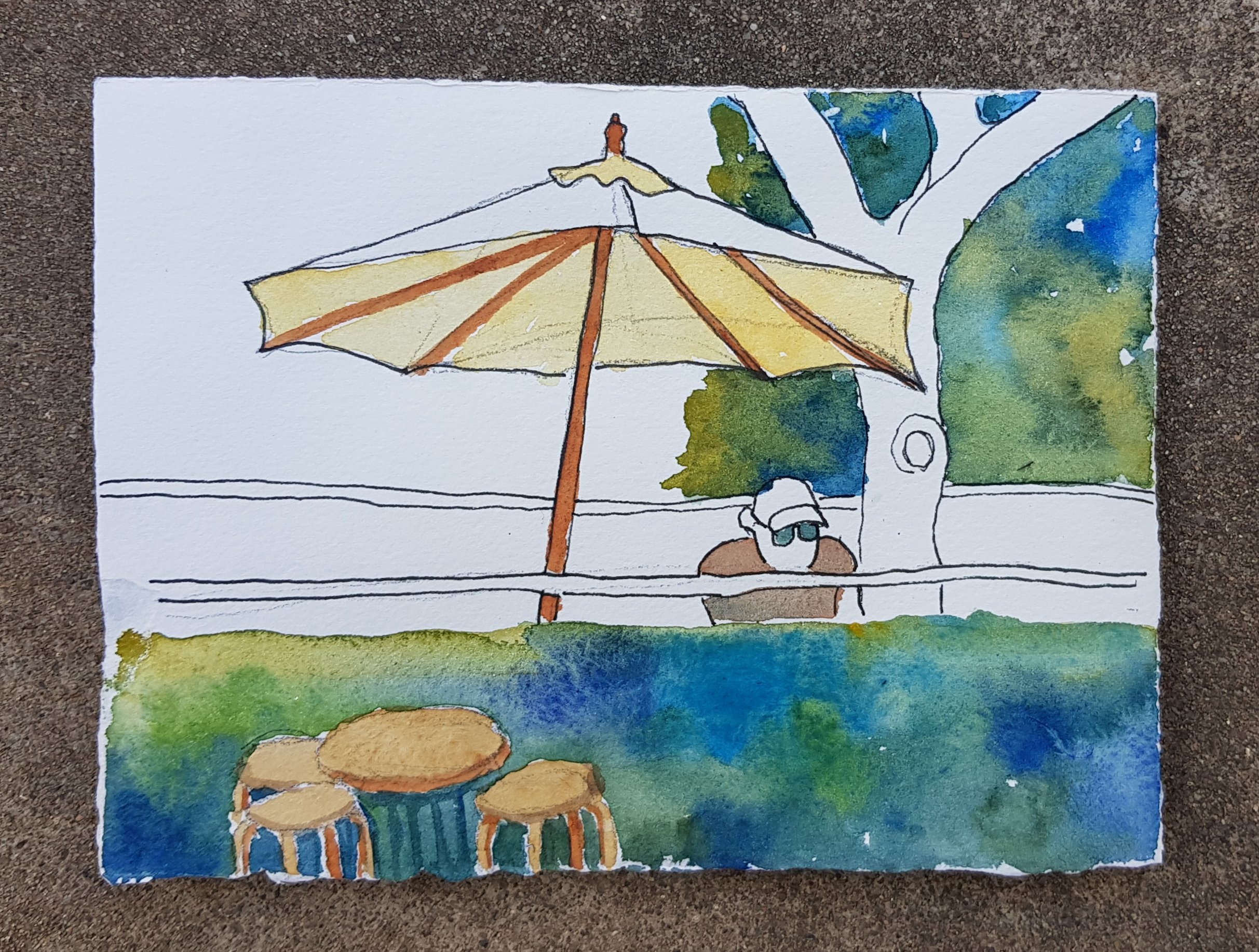 So last night I fixed the bits I wasn’t happy with. Extending the umbrella canopy to make more sense of the top left corner and adding the darker section along the bottom. “Don’t be afraid of the darks, [colours that is]”, as a sketching friend often says.