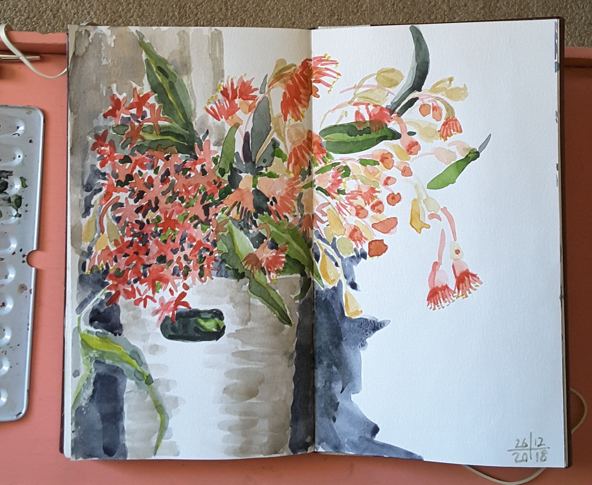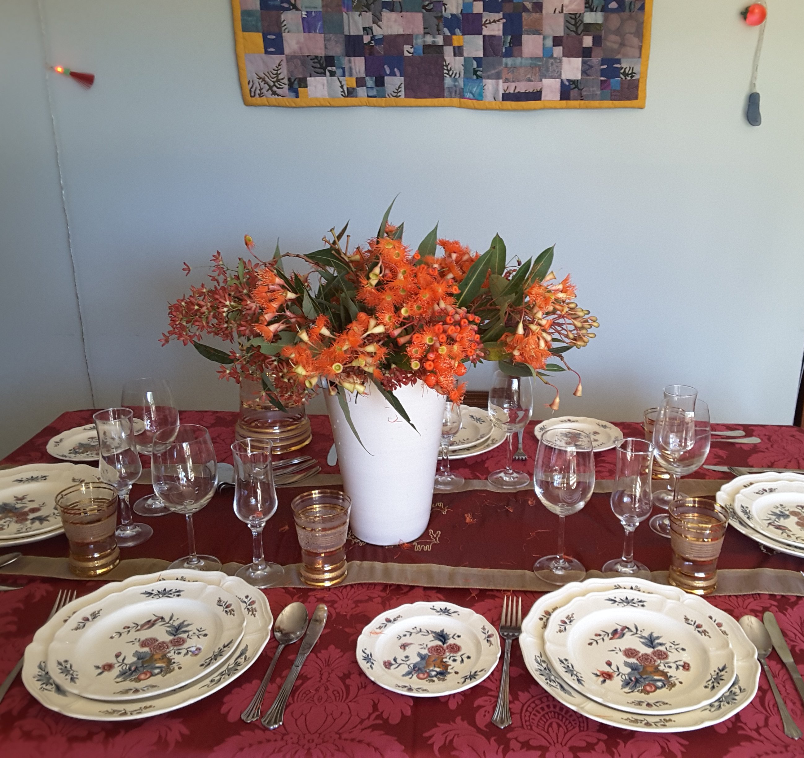 Then decorating the ‘tree’, or in this case branches from our gum tree. I had made the decorations from fabric that I had stencilled, part of one of a video I was making for YouTube. The original video was a washout for a number of reasons, but my decision to try and process the video, the week prior to Christmas, using unfamiliar editing software, was perhaps not my best one. (If you would like to check out what turned out to be a ‘bloopers’ video then follow this link).