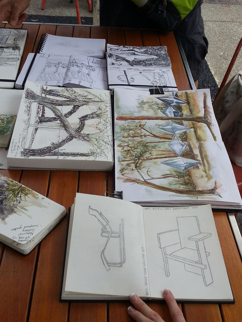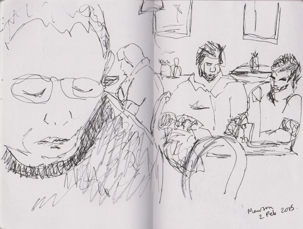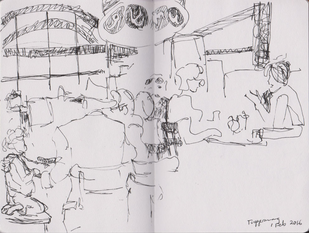 It might of helped if I hadn’t been suffering from the lurgy that my partner caught on the plane and duly gave to me, things didn’t go smoothly. Firstly I needed to upload the Whitelines app which could upload the content of the book to any one of a number of digital platforms, none of which I used. Instagram was the easiest, I didn’t have it, but even with slow hotel wifi I managed to create an account, not to mention figure out yet another password. I was good to go. I knew that using this book required black pens …. that was about all I could remember. I even had a brilliant idea for the sketch, one based on thumbnail I’d done earlier in the day. Now I just had to stay up another half an hour or so (it was already past 11.00pm) and finish the drawing. You can see that this exercise had failure written all over it. It didn’t disappoint. I uploaded the test scribble with no problems. I did the drawing and finished – did I say half an hour – maybe three quarters of an hour later. It didn’t upload. I moved the book under the pallid overhead light it still didn’t upload. Nothing helped, nothing changed the fact that it didn’t upload. Several people tried to help the next day, but it didn’t upload. I put my book bag in my bag and pretty much forgot about it.