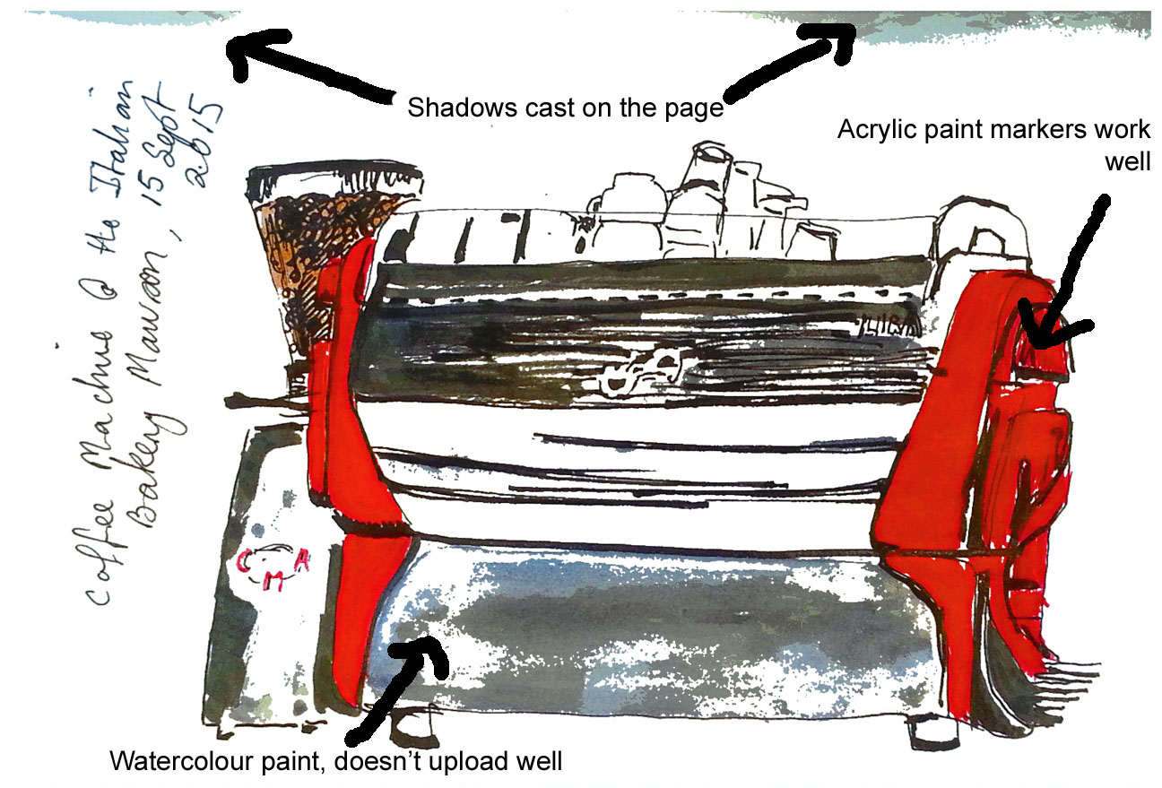 So watercolour doesn’t upload well. I have successfully uploaded images with dark blue ink and also images coloured with acrylic paint-markers. Below I’ve tested several types of markers that I have in my kit.