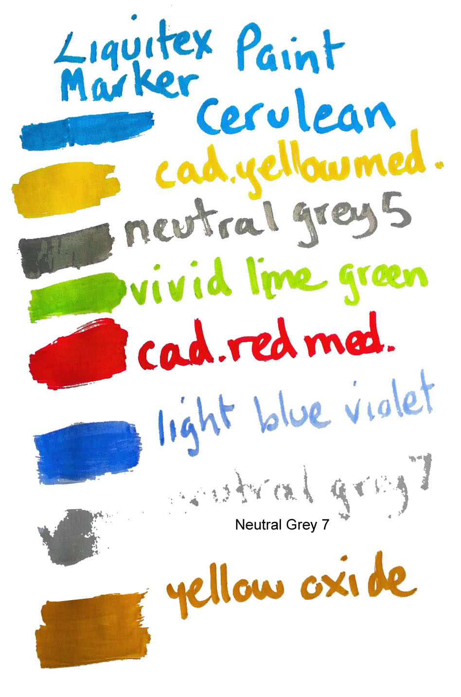 Clearly the flat colours work well, the metallic silver does not. Likewise the app didn’t pick up some of the grey Liquitex acrylic paint-markers I used, see below.
