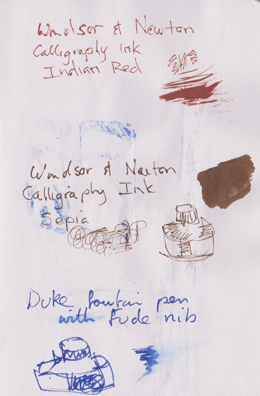 Windsor and Newton calligraphy inks, Indian Red and Sepia and the Duke 209 fude nib using the blue ink cartridge it comes with