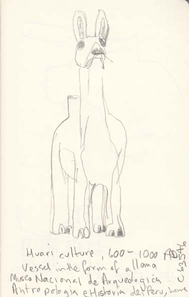 This visit I drew two ‘stirrup’ vases, (they get their name from the shape of the handle), although this is clearly not what their makers, the Moche people called them* because stirrups were not introduced into South America until the Spanish invasion, some 800 years after these pots had been made. Both of these works come from the Museo Larco, in Lima, Peru. Some highlights of the Museum ‘s collection are also accessible through the Google Art Project, which is both in English and Spanish.