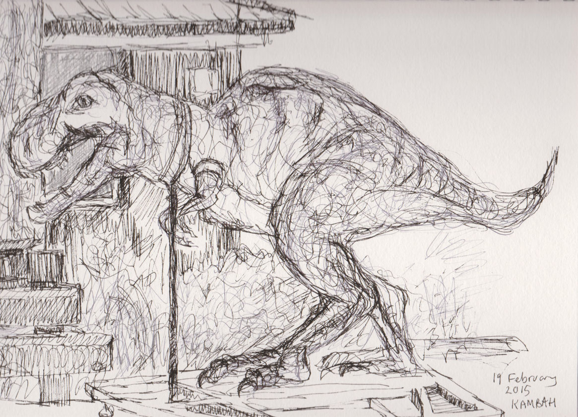 A day later I was driving home in the evening and spotted one of the mini-diggers parked next to our neighbour’s dinosaur (yes there are quite a few of them in our area). By the time I got organised the following morning and got back down the street to make a drawing, the digger driver was getting in the cab ready to drive off. I got two or three quick photos and one very quick sketch. The latter I do intend working up into a drawing, sometime. So in the end all I was left with was Rex so here he /she is (how do you know?)