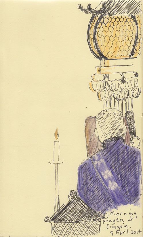 The centre of the main temple complex is the Konpon Daito or Great Pagoda. I sat painting a section of this temple in the chilly morning air, accompanied once more by the sounds of chanting coming from the Kondo or Main Hall.