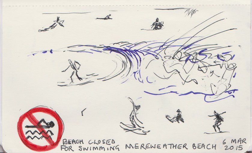 Surfers at Merewether Beach, NSW, pen and ink, ball point pen, 6 March 2015