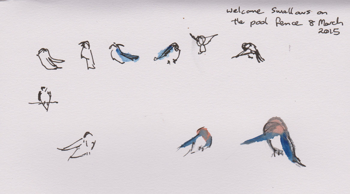 Welcome Swallows preening, pen and ink and watercolour, 8 March 2015
