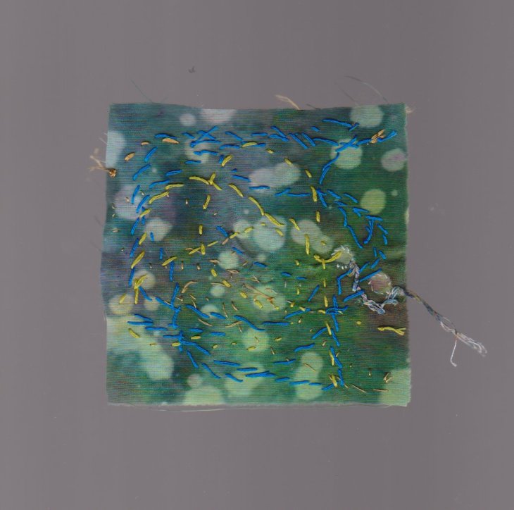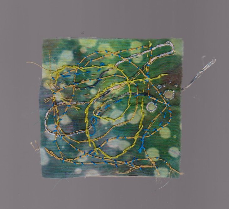 This was a piece that had me thinking of complex wetlands, filled with intense colours and flashes of light, glinting off the water. Couching the threads down proved quite challenging, so choosing to use some slippery rayon thread was possibly more challenging than necessary. Here are the photos of the front and back sides, now that I have worked on it.
