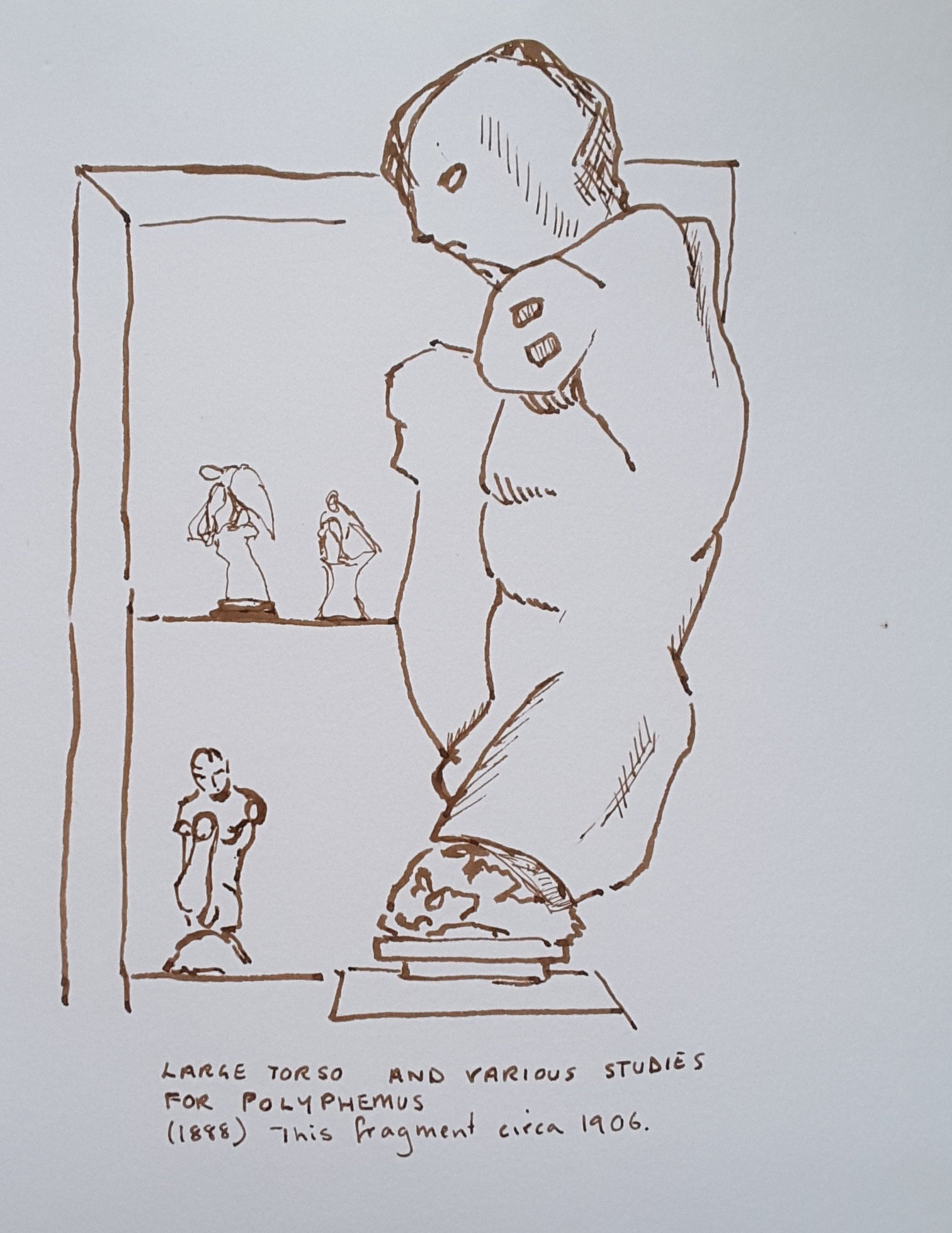 My first sketch was a grouping of stone sculptures, Torso, 1948 by Rosemary Madigan and Number 24, Harry Boyd by Robert Klippel and a third piece, an Anthropomorphic monument [gowe nio niha], (19th century or earlier) from the island of Nias in Indonesia. I was instantly drawn to the sandstone used in the two Australian works. The deep gougemarks on the Klippel sculpture acted like lines drawn across the surface. In contrast the smoother texture of Madigan’s work supported the subtlety of her torso’s carved planes.