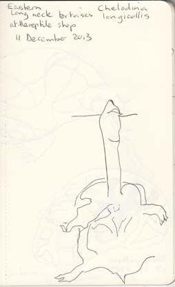 The reptile shop next to our regular cafe has placed a large tank containing Eastern Longnecked Turtles (Chelodina longicollis) where they can be observed from outside the shop. These turtles are quite common in the waterways of eastern Australia and are one of the few native animals often kept as pets.