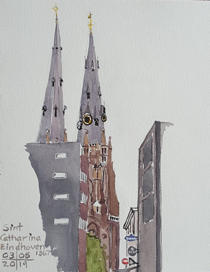 On a more traditional note is Sint Catharina in the city centre. Despite its Gothic look it was designed by Petrus (Pierre) Cupyers and built between 1859-67. It replaced an earlier derelict medieval church on the same site. Cupyers was definitely going for the over-the-top neo-gothic style, influenced by 13th century French Gothic churches. The two towers are different from each other. The slender Ivory tower symbolising the purity of the Virgin Mary and the chunkier one representing the strength of King David. Whatever. It made for two interesting elements to paint.