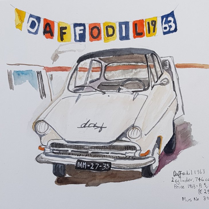 While I am probably the least car fanatical person around I was encouraged by positive comments from other non-car people to visit the DAF Museum. There certainly was lots to see and even I have to admit that there were lots of interesting older cars to sketch. The cutest car of the lot, a 3-wheeler nick-named ‘the portable raincoat’, was right in the entrance foyer, but there was no suitable place to sit and sketch. So I settled on sketching this 1963 sedan the Daffodil.