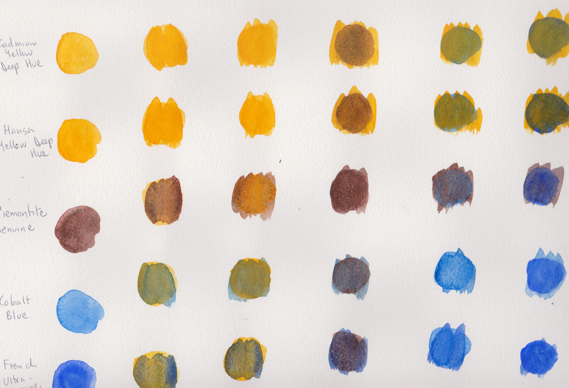 I started by making a series of colour tests, mixing the 16 paint samples in a matrix, just as they came on the sample card.